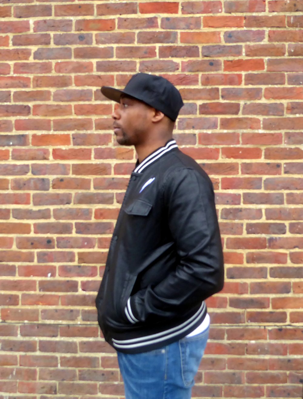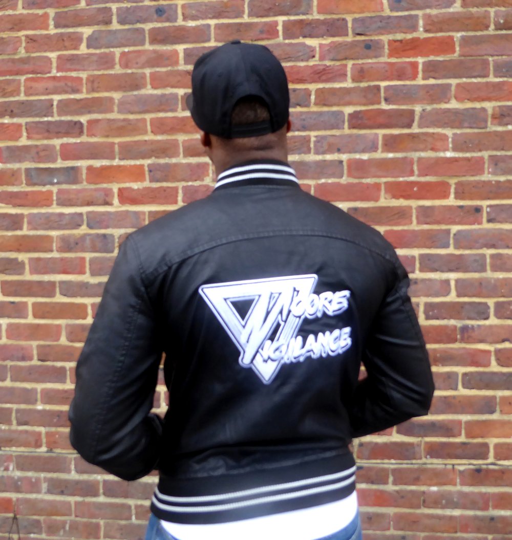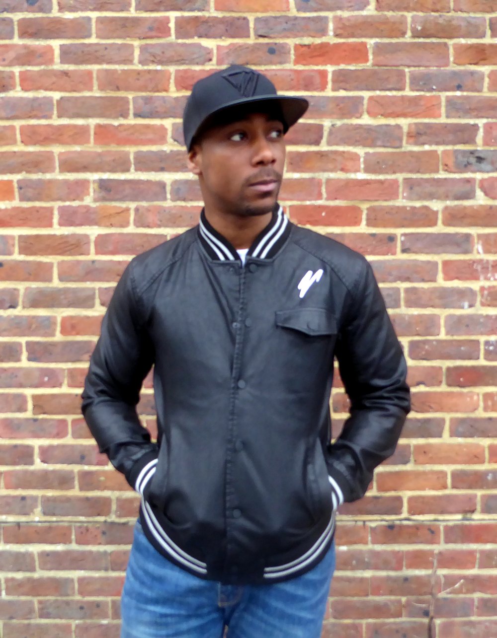 - BLACK LEATHER LOOK VARSITY JACKET WITH WHITE DETAIL